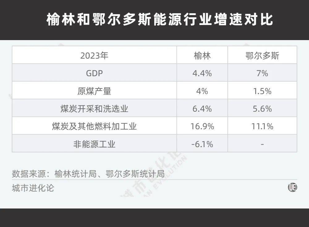 上一年,鄂尔多斯原煤产量增速低于榆林、能源相关产业的增速也低于榆林,但整体 GDP 增速却比榆林高。这说明鄂尔多斯其他产业的增速更快,转型效果初显。