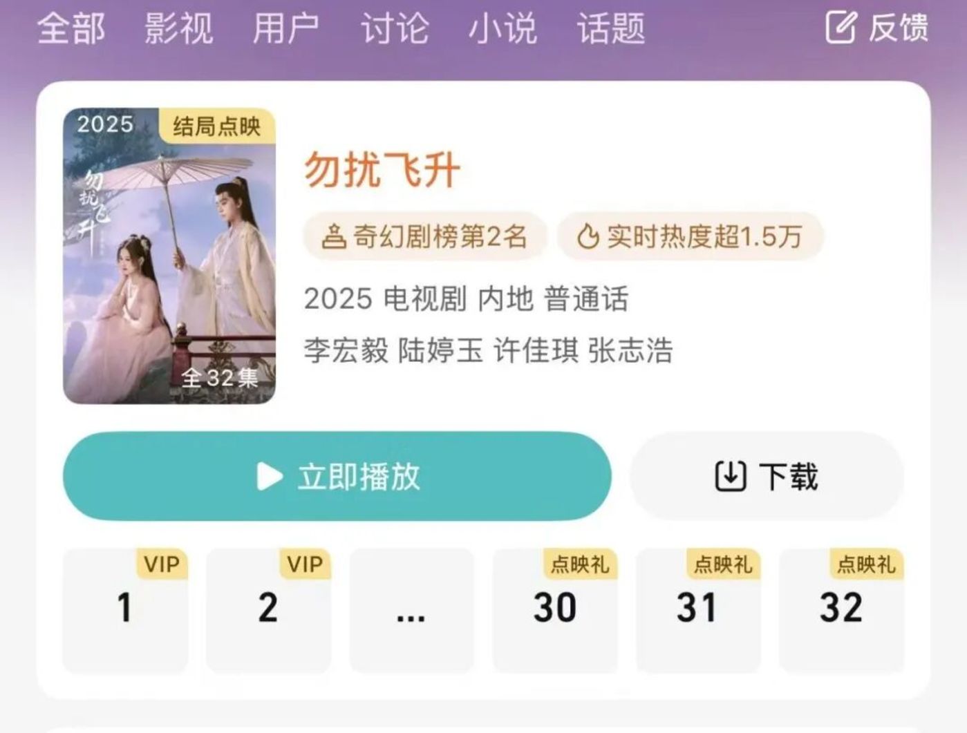 目前已播出的剧集,是腾讯的 《勿扰飞升》,其率先锁定了仙侠甜宠的垂直受众。目前豆瓣尚未开分,虽然先播在一定程度上预热了市场,但其口碑一旦下滑也会阻断新受众的加入。相较于另外三部头部配置的质感向作品,《勿扰飞升》 轻喜风也算得上 「别具一格」,更像是年底古装三宝的一道 「前菜」。