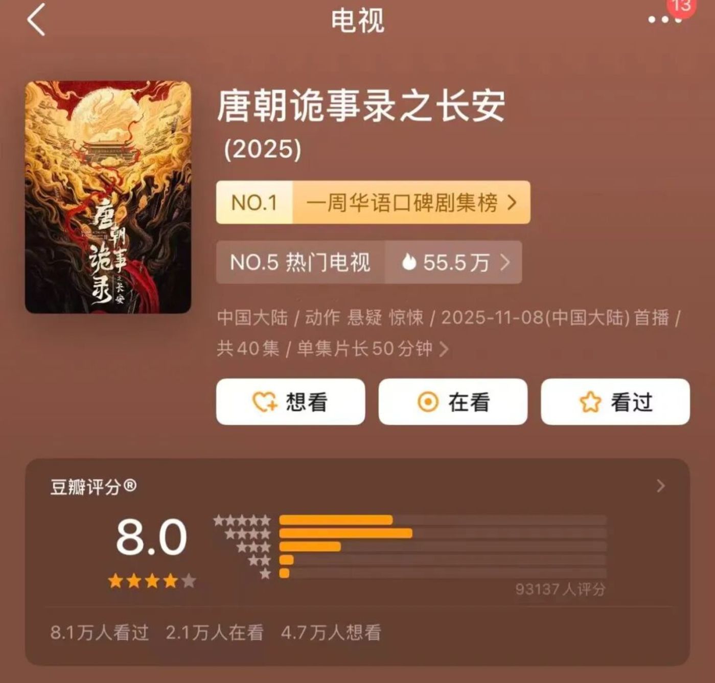 爱奇艺的 《唐朝诡事录之长安》 在开播前预约就超过 400 万,一开播更是直接豆瓣开分至 8.1 分,目前豆瓣评分仍在 8.0 分,位居上新长剧首日有效播放量冠军位置。「唐诡」 系列用逻辑缜密、烧脑奇诡的探案故事,打破了 「续集魔咒」,并为平台赢得较高的拉新成绩。