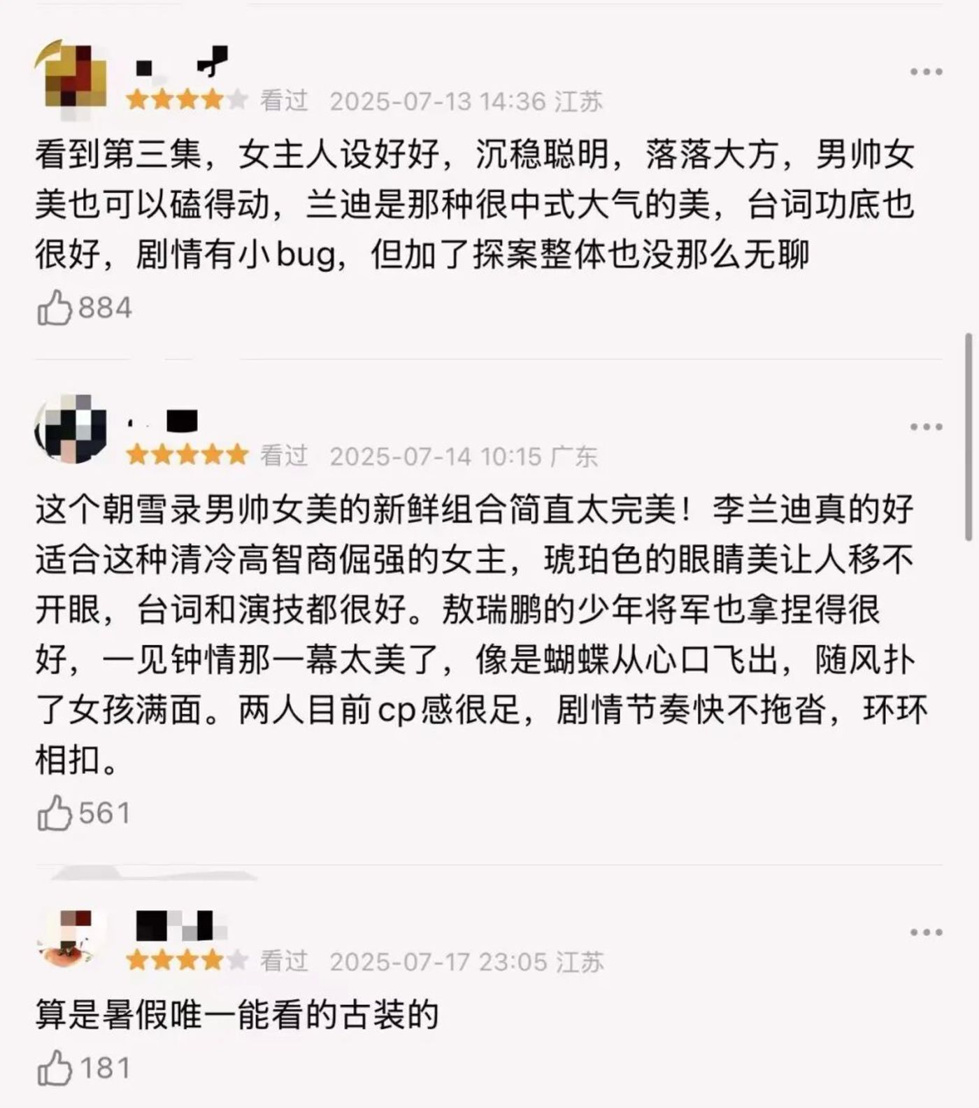 而暑期档的 《朝雪录》 以黑马姿态突围,也让行业眼前一亮。累计播放量 18 亿,热播期集均 3469 万;爱奇艺站内热度破万,单日峰值 7071 万。这部作品的题材优势明显,融合悬疑探案与权谋元素,主演李兰迪、敖瑞鹏演技,在社交媒体上讨论较为热烈,获大部分观众认可。