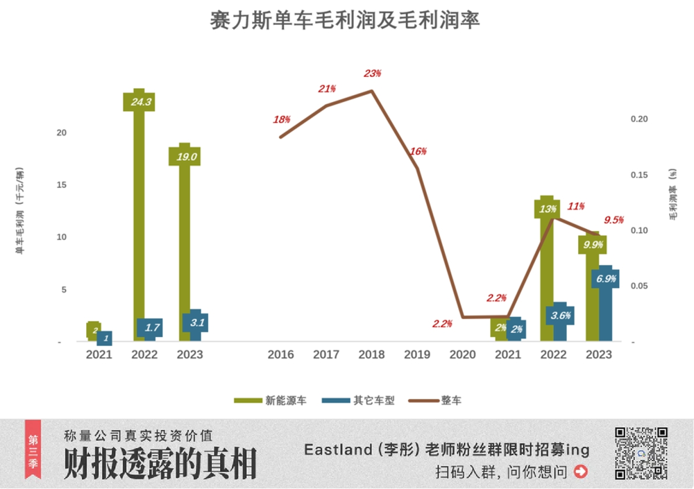 2023 年,汽车业务毛利润率 9.5%。新能源车毛利润率为 9.9%、单车毛利润 1.9 万元。