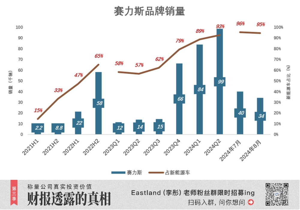 2024 年 8 月,赛力斯品牌销量环比下降 15%、至 3.4 万辆,占新能源车总销量的 94.6%。