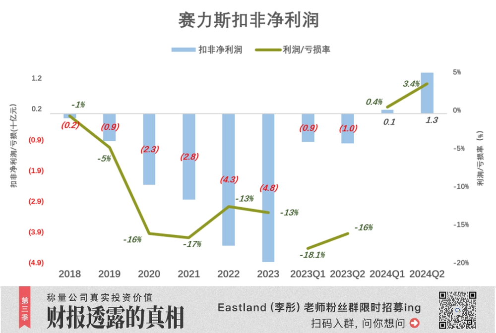 2017 年,赛力斯销量、毛利润率分别超过 40 万辆和 20%,随后连续 6 年亏损 (扣非)。