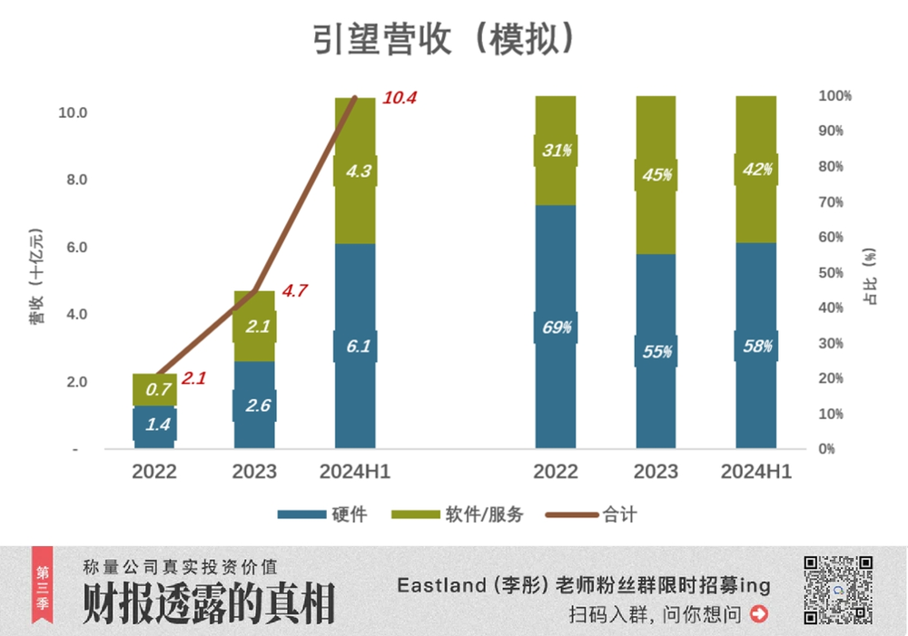 2024 年 H1,引望营收 104 亿。其中硬件 61 亿、占比 58.4%;软件/服务 43.4 亿、占比 41.6%;