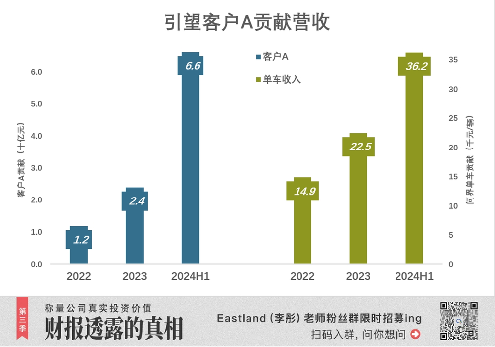 五大客户中占比最高的 「客户 A」,非赛力斯莫属。2024 年 H1 贡献营收 66 亿、占引望营收的 63.4%(2023 年这个比例为 51%)。