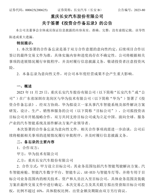2023 年 11 月 25 日,华为与长安汽车 (000625.SZ) 签署 《投资合作备忘录》,要点如下: