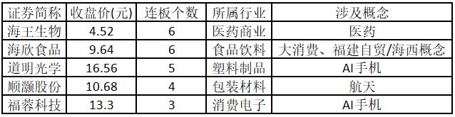 从连板情况来看,今日首板个股有 37 只;2 连板的个股有 6 只;3 连板及以上的个股有 5 只。今日连板数排名前 5 的个股包括海王生物、海欣食品、道明光学、顺灏股份、福蓉科技,具体如下表所示。