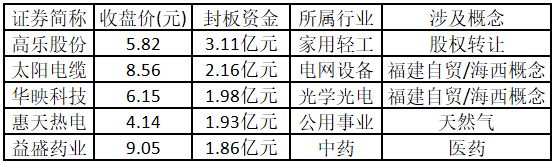 从封板资金来看,今日涨停板个股中,封板资金排名前 5 的个股包括高乐股份、太阳电缆、华映科技、惠天热电、益盛药业。欢迎大家关注微信公众号 「道达号」,其 「道达涨停复盘」 栏目为大家解读。