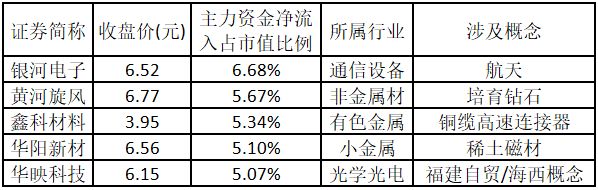 主力资金净流入金额占市值比例排名前 5 的个股分别为银河电子、黄河旋风、鑫科材料、华阳新材、华映科技。