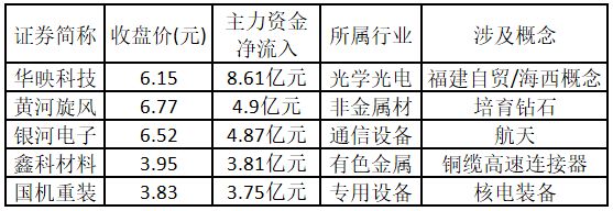 从主力资金来看,今日涨停板个股中,主力资金净流入金额排名前 5 的个股分别为华映科技、黄河旋风、银河电子、鑫科材料、国机重装。