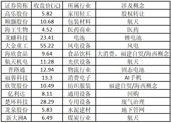 涨停板个股中,股价创出近一年新高的个股有 14 只 (不包括创出历史新高的个股),包括高乐股份、顺灏股份、海王生物、龙蟠科技、大金重工、海欣食品、航天机电、普路通、福蓉科技、欣贺股份、亿利达、楚环科技、龙泉股份、新大洲 A,具体如下表所示。