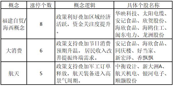 从概念特征来看,今日涨停板个股中,福建自贸/海西概念、大消费、航天概念的个股最多。