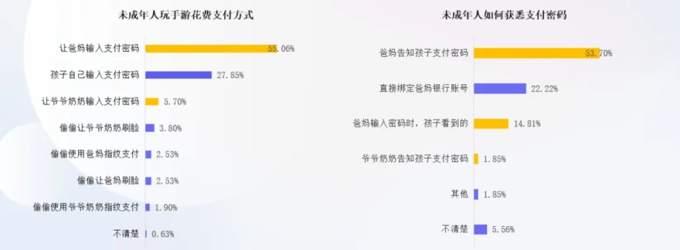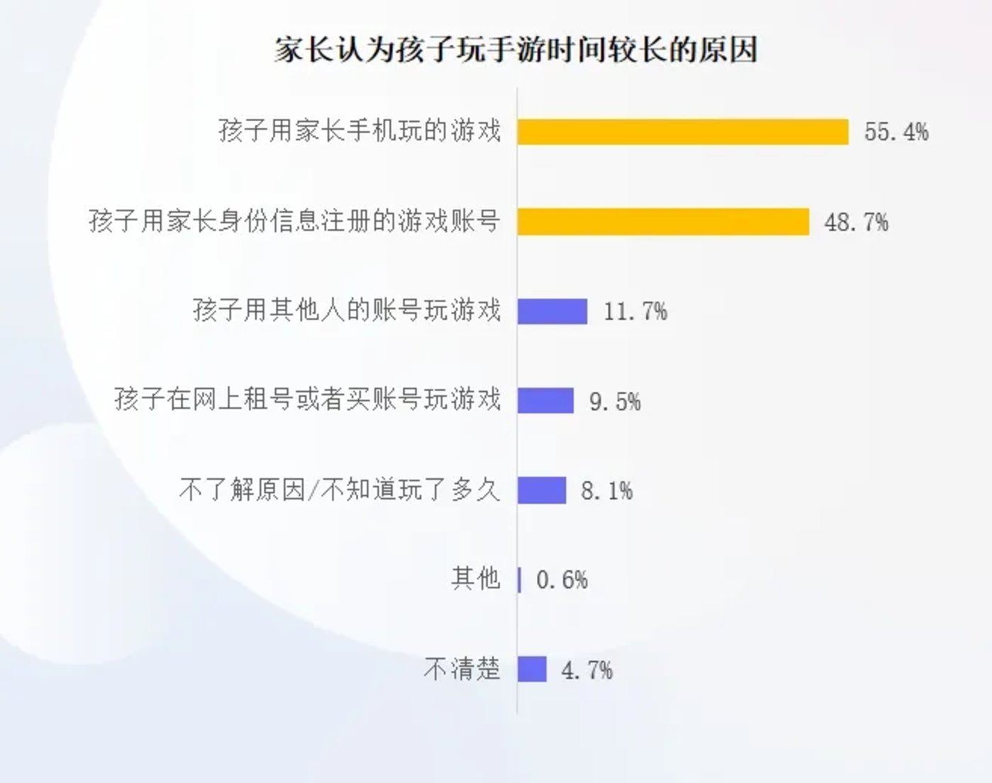 调研数据显示,73.8% 的家长知晓自己的孩子曾有过使用成年人账号绕过监管玩手游的情况;未成年人玩手游时间较长的原因主要是用家长手机玩的游戏、用家长身份信息注册的游戏账号,占比分别为 55.4%、48.7%。