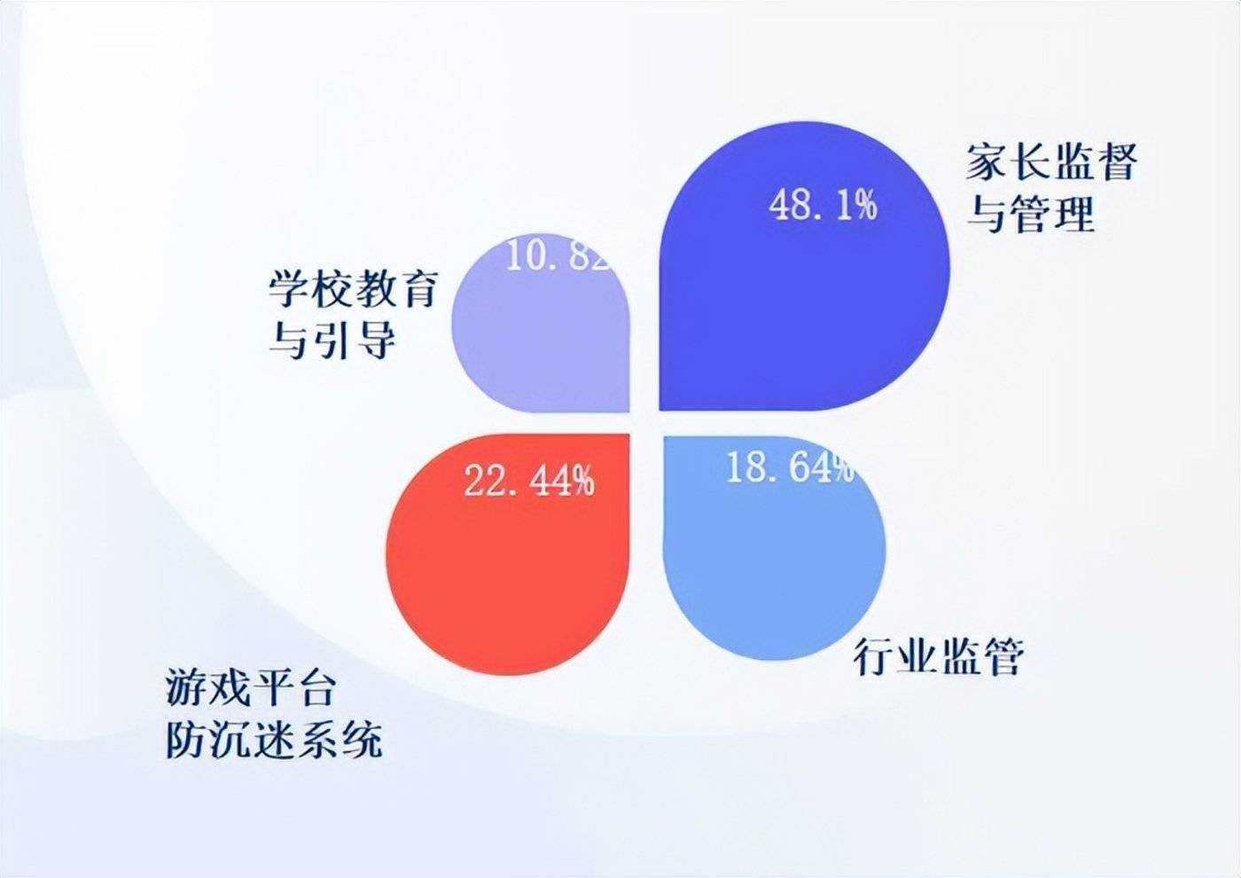 《报告》 就显示,「对于解决或改善孩子过度玩手游,48.1% 家长认为家长监督与管理最重要,22.44% 家长认为是游戏平台防沉迷系统建设,18.64% 认为是行业监管,10.82% 认为是学校教育与引导。」