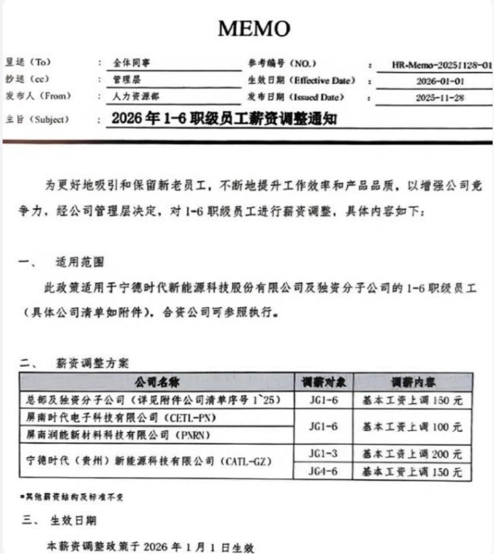 据此前网传的宁德时代薪资调整通知,为更好地吸引和保留新老员工,不断地提升工作效率和产品品质,以增强公司竞争力,经公司管理层决定,自 2026 年 1 月 1 日起对 1-6 职级员工进行薪资调整。