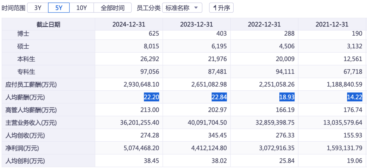 另据同花顺 iFind 数据,2024 年,宁德时代员工的人均薪酬约 22.2 万元,虽较 2021 年的 14.22 万元大幅提升,但相较于 2023 年的 22.84 万元略有下降,同比减少 0.64 万元。