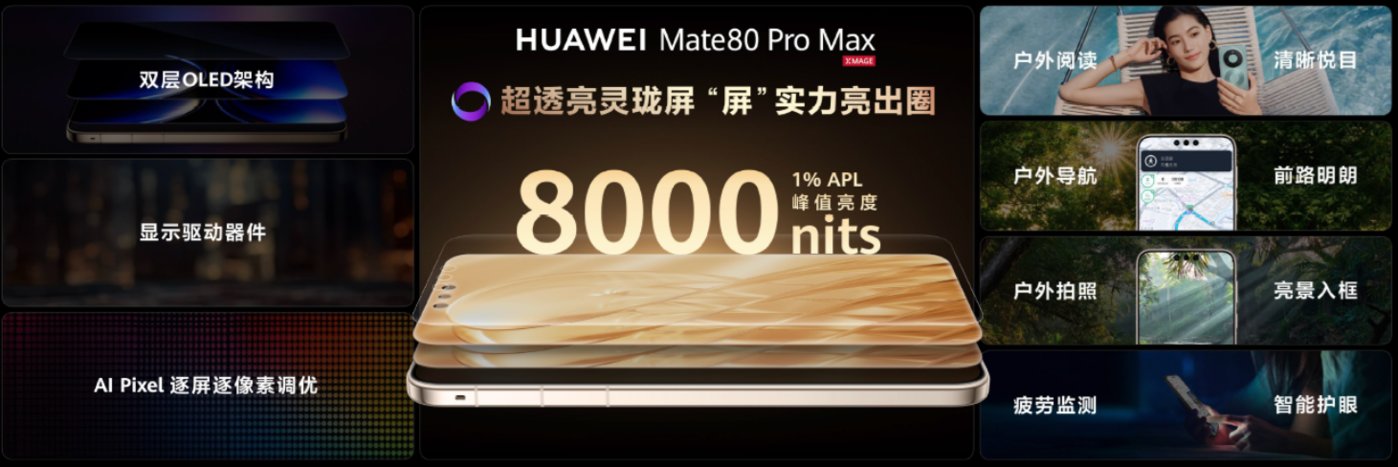 与此同时,屏幕作为交互的第一介质,华为再次打破显示的边界,解决了业界双层 OLED 的历史难题,凭借独家定制显示驱动器件与 AI Pixel 技术攻破了双层 OLED 色偏,色彩不准的问题。在芯片深度算法调优下呈现出 1% APL 峰值亮度达 8000nits,20% APL 峰值亮度 4500nits 的屏幕。即便是在户外烈日强光下,或者光线复杂的环境下,屏幕也不会 「失色」,看得清且通透不费眼。