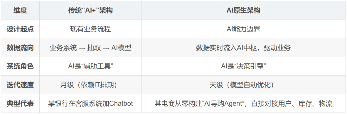 如果说“AI+” 是在现有系统上“ 打补丁” 或“ 外挂”AI 功能,那么 AI 原生则意味着以 AI 为系统设计的底层逻辑与能力中枢,这套系统为 AI 而生、因 AI 而长,驱动从技术架构、业务流程、组织角色到价值创造方式的全方位重塑。