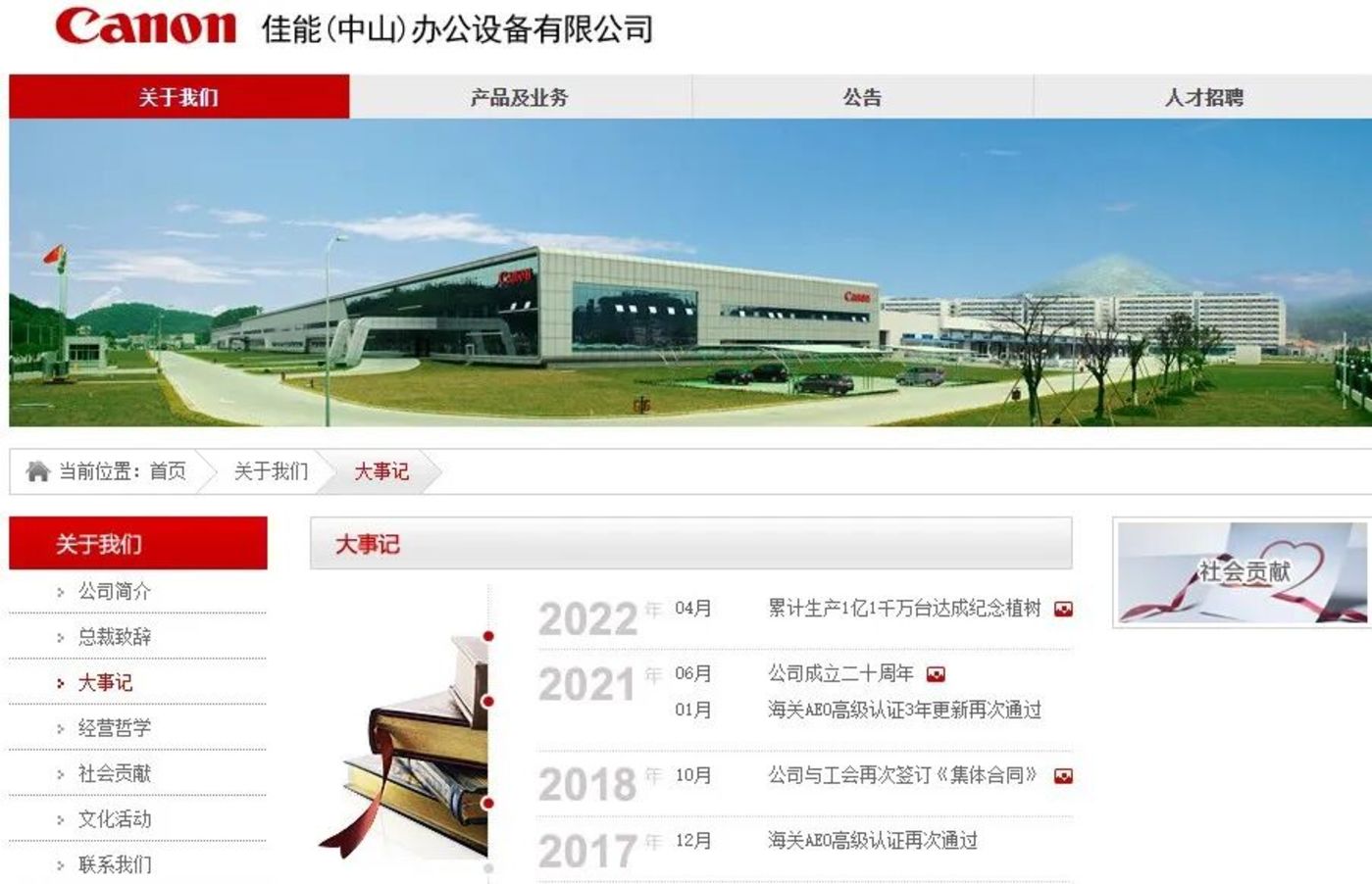 在佳能 (中山) 办公设备有限公司官网上,公司大事记还记录着 2022 年 「累计生产 1 亿 1000 万台」 的字眼。2022 年之后,大事记就再也没有更新过。