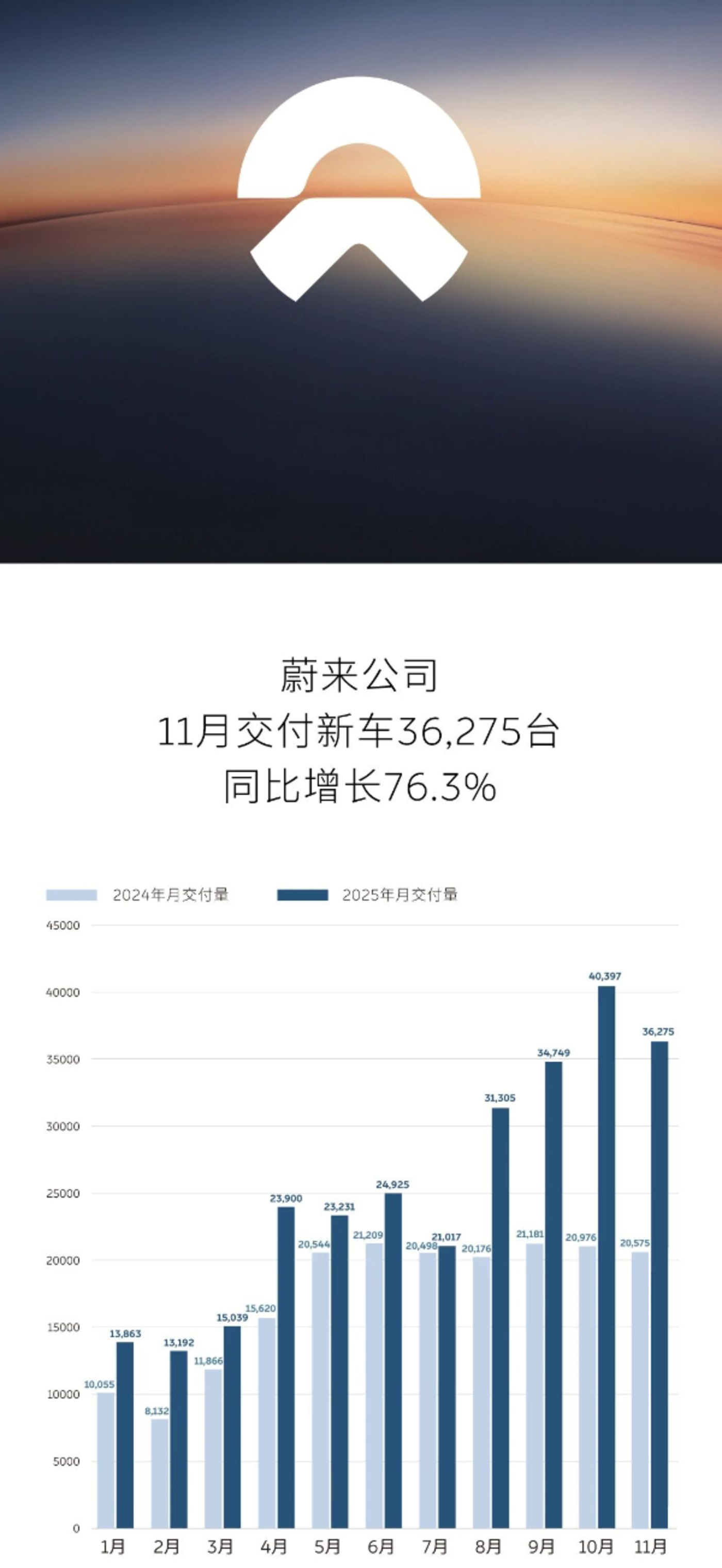 蔚来汽车 11 月新能源销量表现亮眼,同比增长 76.3%,交付新车 36,275 台。自今年 8 月以来,蔚来汽车交付量已连续四个月超过 3 万台。