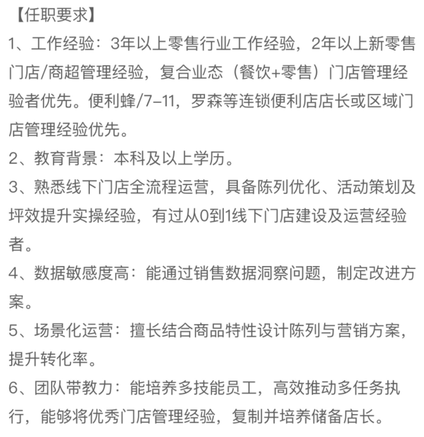 招聘启事显示,东方甄选对店长的要求尤为苛刻,不仅需要 5 年以上零售行业经验、3 年以上新零售门店管理经验,还特别强调 「餐饮+零售」 复合业态管理背景,优先考虑便利蜂、7-ELEVEn、罗森等品牌的从业者。显然,东方甄选迫切希望借助成熟人才快速搭建运营体系,以弥补自身在线下运营经验上的短板。