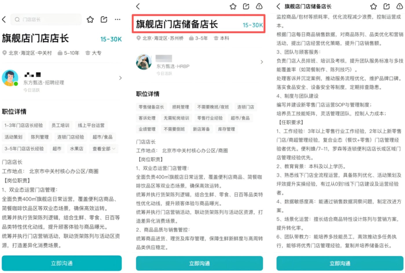 紧接着,《北京商报》12 月 3 日披露的一则招聘启事引发行业聚焦:东方甄选正以 1.5 万至 3 万元月薪,为北京首家旗舰店寻觅店长,优先锁定 「餐饮+零售」 复合业态管理人才。