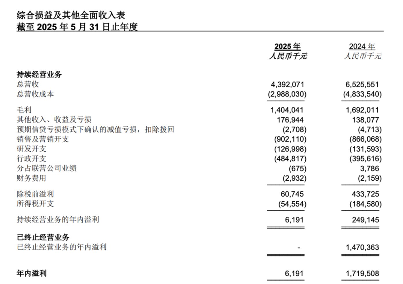 一边是直播电商流量红利见顶,另一边则是公司营收连续下滑。2025 财年财报显示,东方甄选总营收 44 亿元,同比减少 32.7%;持续经营业务净溢利 620 万元,较上年同期的 2.49 亿元大幅下降 97.5%。全渠道已付 GMV 从 143 亿元降至 87 亿元,抖音渠道订单量由 1.8 亿单下滑至 9160 万单。