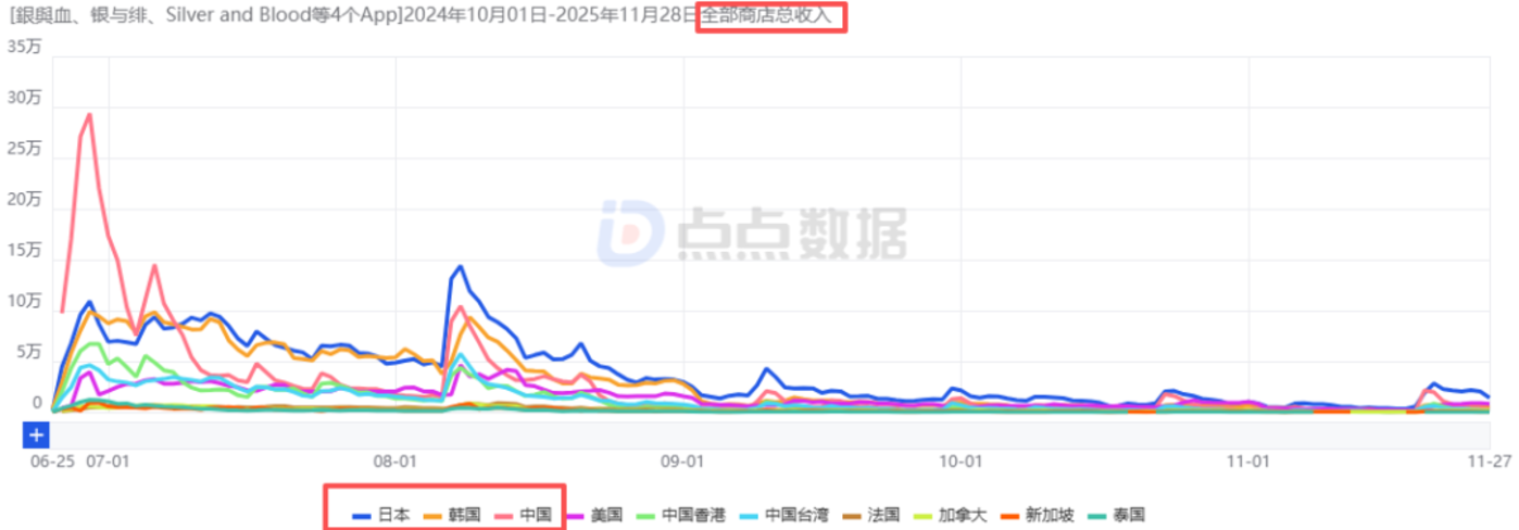 紧接着是 6 月 26 日全球同步上线的暗黑哥特幻想二次元 RPG《银与绯》(移动端及 PC 端),其首月流水虽然冲至 8011 万,但此后开始快速下滑,目前月流水已经不足 800 万元,其累计流水约为 1.7 亿元,其中日本、韩国以及中国 iOS 端分别占比 24.8%、19.66%、18.09% 位列 TOP3。