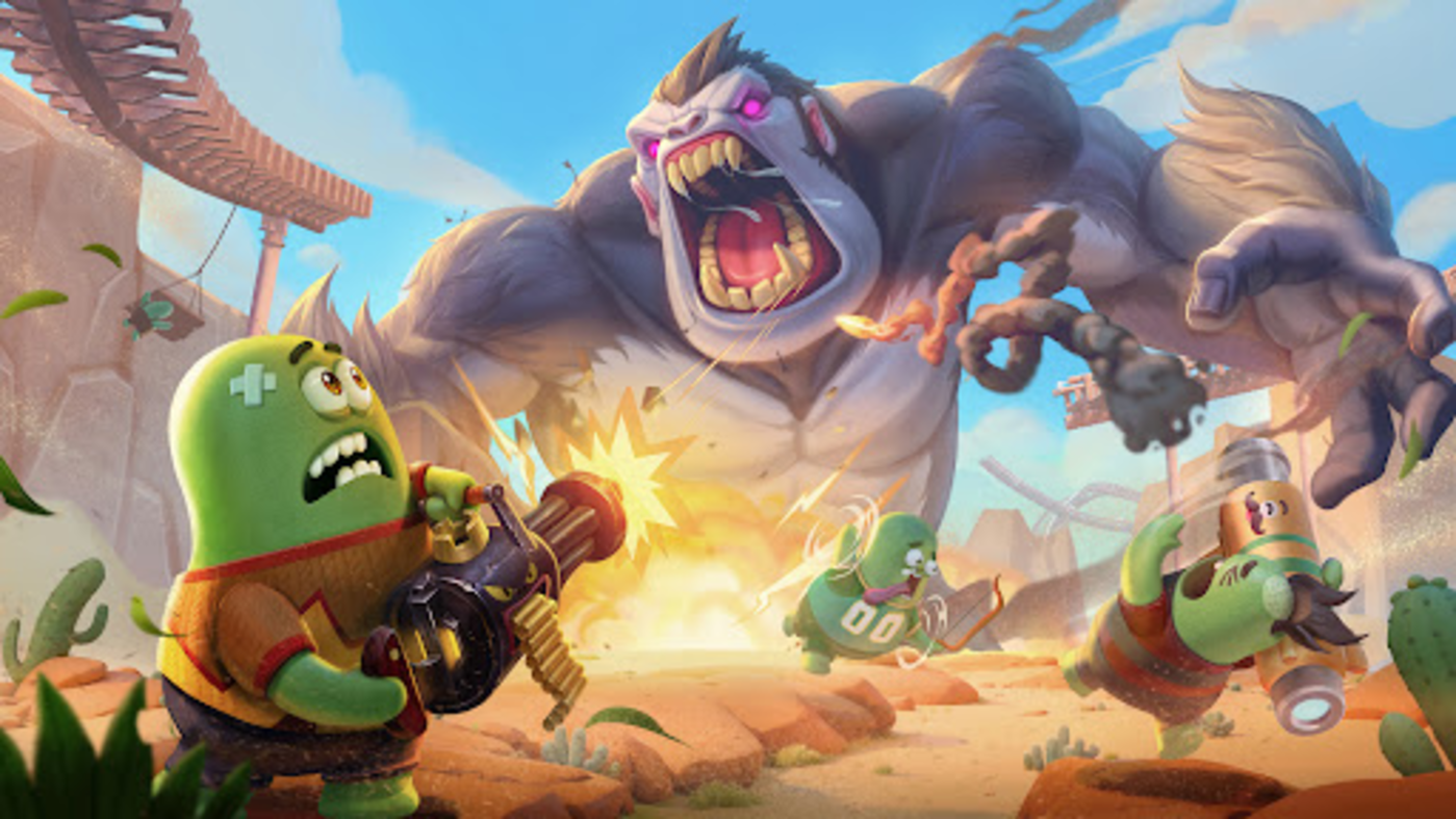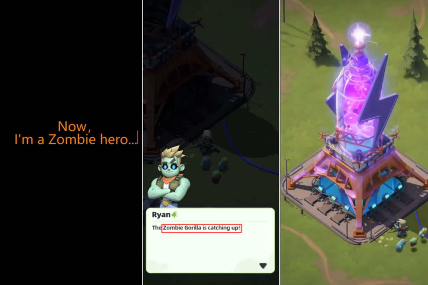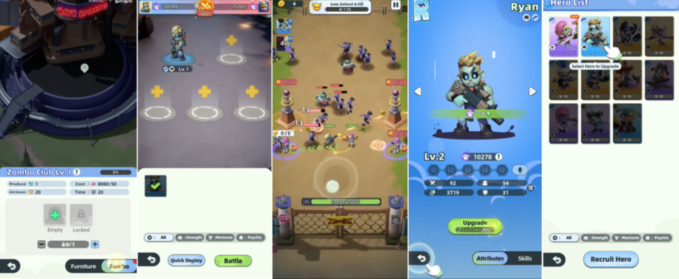 回到游戏层面来简单阐述下 《ZombieWorks》,其首先在世界观和美术上做出了区分度,不同于其他僵尸题材 SLG 中,僵尸一直作为反派角色出现,该作的主角是一位 「僵尸英雄」,他需要帮助一群采用萌系卡通风格形象类似小黄人的僵尸同伴,对抗僵尸猩猩以及各类僵尸敌人。