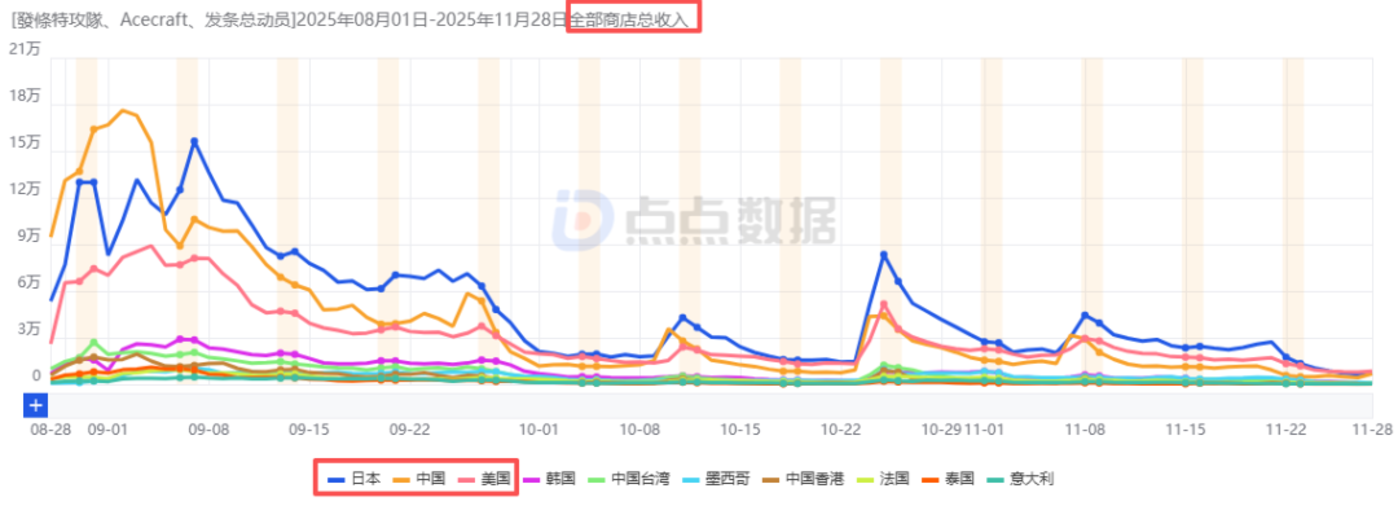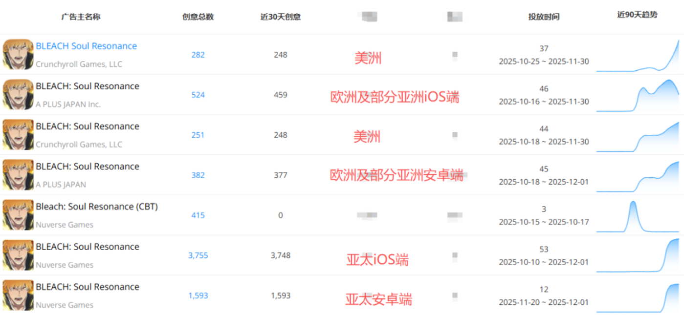 买量方面则是明显倾斜于 IP 的核心辐射市场,该作最早于今年 10 月中旬才开始投放 (公测前一个半月),公测前两天投放力度才开始明显拉升,亚太地区是其投放量最大的区域,欧美则不够给力,而这也与流水的区域分配几乎一致;