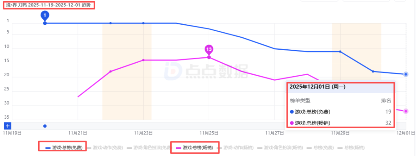 于是时间来到 11 月 21 日,《境·界 刀鸣》 在全球近 170 个国家及地区正式开启公测 (未上线日本及印度市场),首日便冲上 70 个区域市场 iOS 游戏免费榜 TOP10,(位于 32 个区域市场 TOP1,包含中国大陆、美国、英国、法国等),期间登上近 40 个区域市场 iOS 游戏畅销榜 TOP50(国内最高为 13 名、中国台湾为第 9、韩国为第 16、美国为第 85)。目前其依然位于 iOS 游戏免费榜国内第 32、泰国第 8、中国台湾第 18、韩国第 26 的位置。