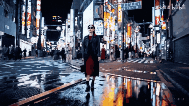 再比如下面生成对比 Sora 演示场景,一位时尚女性走在东京的街道上,街道上到处都是温暖的霓虹灯和动画城市标识。她穿着黑色皮夹克、红色长裙和黑色靴子,手拿黑色手提包。她戴着太阳镜,涂着红色口红。她自信而随意地走着。街道潮湿而反光,五颜六色的灯光营造出镜面效果。许多行人走来走去。