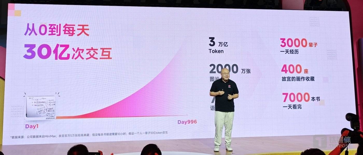 闫俊杰在演讲中透露,截至目前,MiniMax 每日可以给全球用户提供超 30 亿次交互,每天处理超 3 万亿 Token,属国内日处理量、交互时长最高。其中,超 3 万亿文本 token,相当于一天内体验完 3000 段人生;每日生成 2000 万张图片,相当于 400 座故宫的画作收藏;每日合成 7 万小时语音,相当于一天读完 7000 本书;