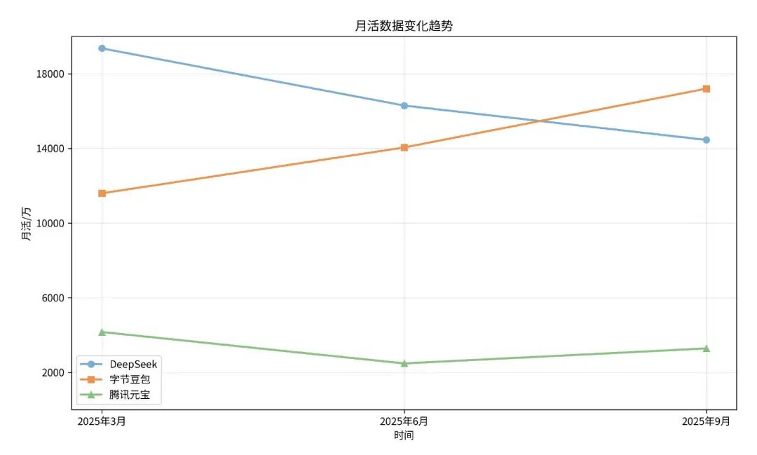 图/元宝、DeepSeek、豆包月活趋势图 数据来源/Quest Mobile