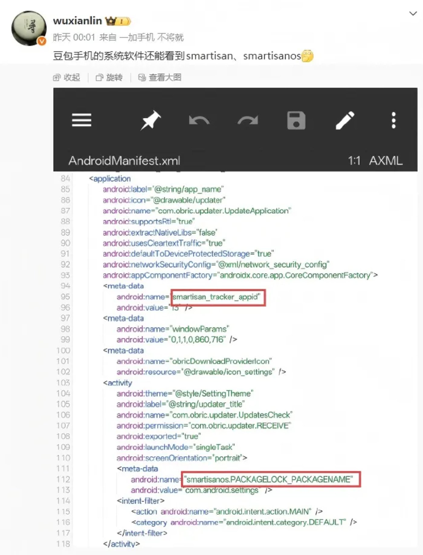 最让人惊讶的,不是豆包手机对 AI Agent 调用能力的实现,或者实际操作中的 「翻车」 体验,而是当开发者把豆包手机的系统解包后,在代码里看到了 smartisan、smartisanos、smartisan tracker appid 的字段。