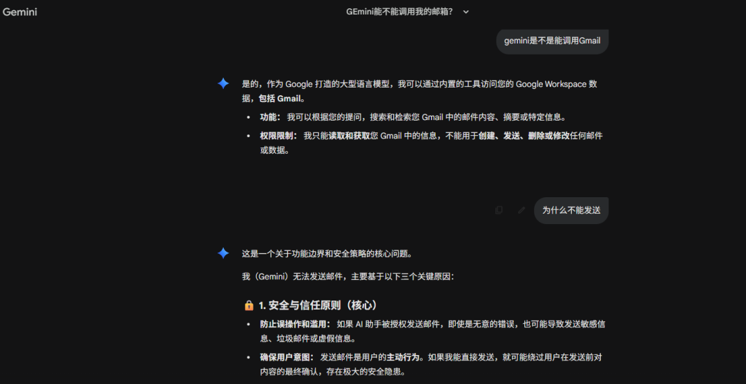 在涉及到用户隐私的应用,如邮箱时,谷歌表现得非常克制,Gemini 只有在用户请求时才会调用相关数据,且不会进行发布邮件等敏感行为。