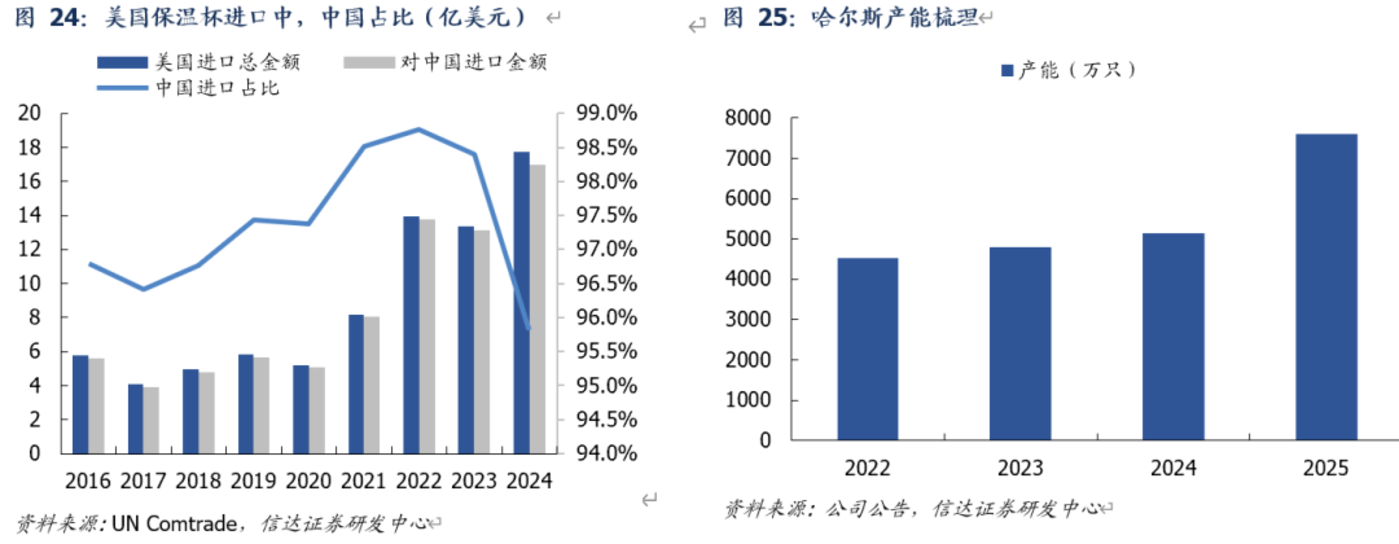 哈尔斯是中国杯壶行业第一家在海外布局产能的中国企业。2023 年,泰国一期工厂投产,产能 550 万只;2025 年,二期工厂建成投产,产能 2450 万只。两期合计,泰国设计产能达到 3000 万只。