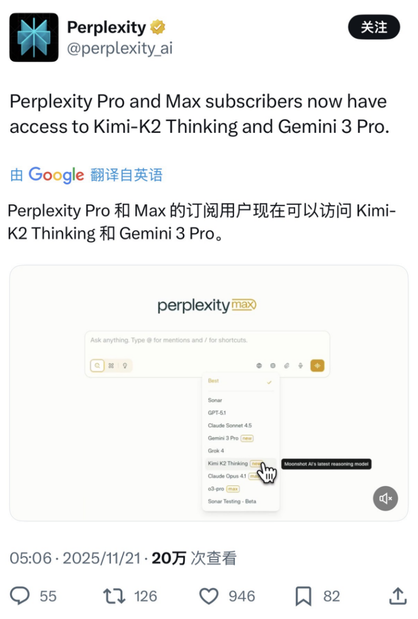 今年下半年,月之暗面先后拿出了两个奠定地位的模型 Kimi K2 和 Kimi K2 Thinking。前者作为非思考模型,在多个测试中拿到开源模型的 SOTA;后者不仅能力大幅升级,还成为著名 AI 搜索 Perplexity 目前唯一接入的国产模型,同时被官宣的,正是刚刚屠榜的 Gemini3 Pro。而上一个有此待遇的中国模型,是风光无限的 DeepSeekR1。