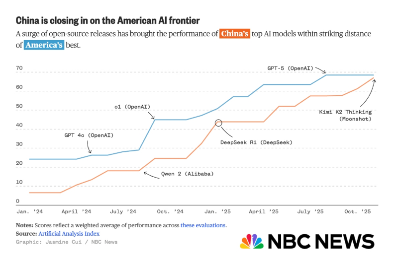 11 月 30 日,美国 NBC News 报道,随着中国开源生态的崛起,以 Kimi K2 Thinking 模型为代表的中国顶尖模型,性能接近美国最优秀的水平。