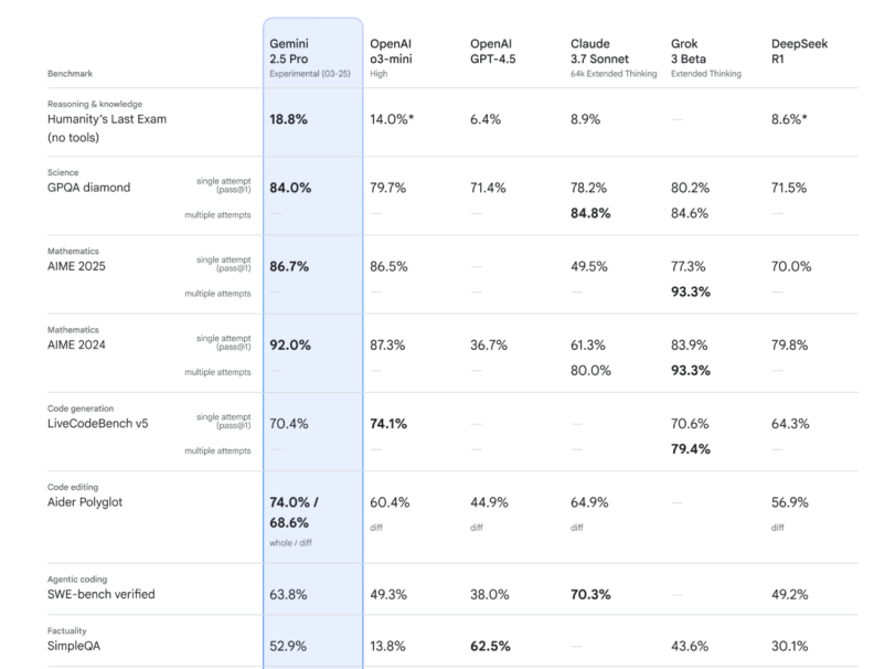彼时,OpenAI 惯用一种套路针对谷歌,即卡中其新模型的发布时间,提前一天发布自家产品。而这一次,谷歌“ 以其人之道还治其人之身”,把 Gemini 2.5 Pro 的发布提前到 OpenAI 产品发布的前一天。Gemini 2.5 Pro 也不负众望,在多项指标上超过 O3-mini,站上了最强模型的竞技场。