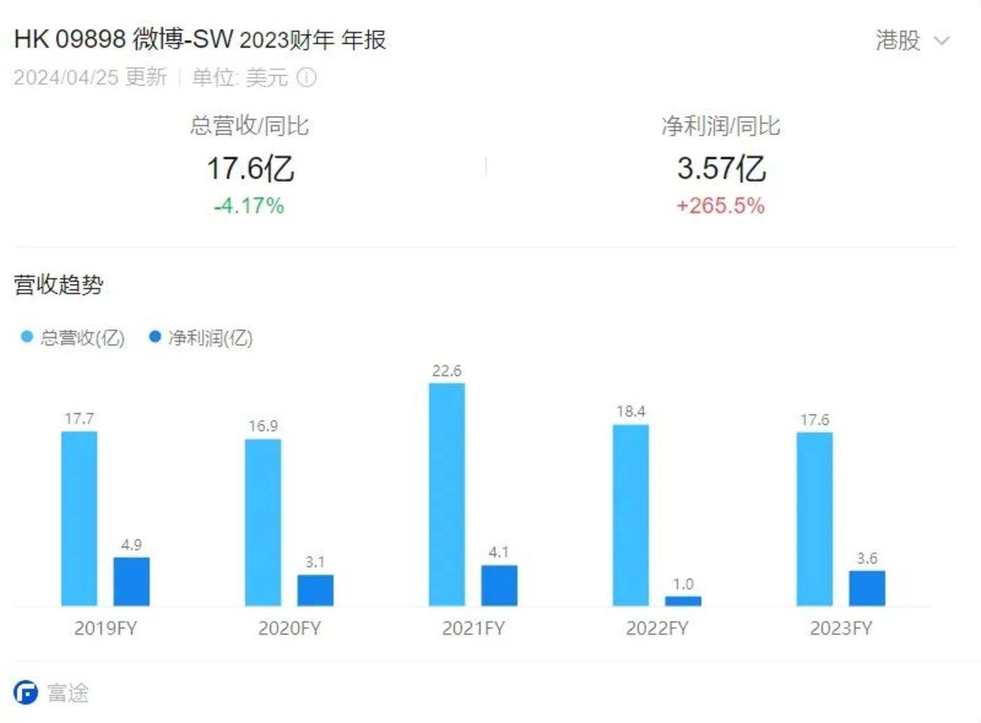 微博在这个过程中失去了最宝贵的 「人味儿」。而它的营收增长在 2018 年抵达高点后,也一路下滑。2017 年,微博总营收同比增长 76%;2018 年起,增速分别为 48%、7%、-4%、33.7%、-19%、-4%。广告业务营收的曲线也大约同步:2017 年,广告业务营收同比增长 75%,2018 年开始,这一数字变成了 49%、12%、-3%、33%、-19%、-4%。