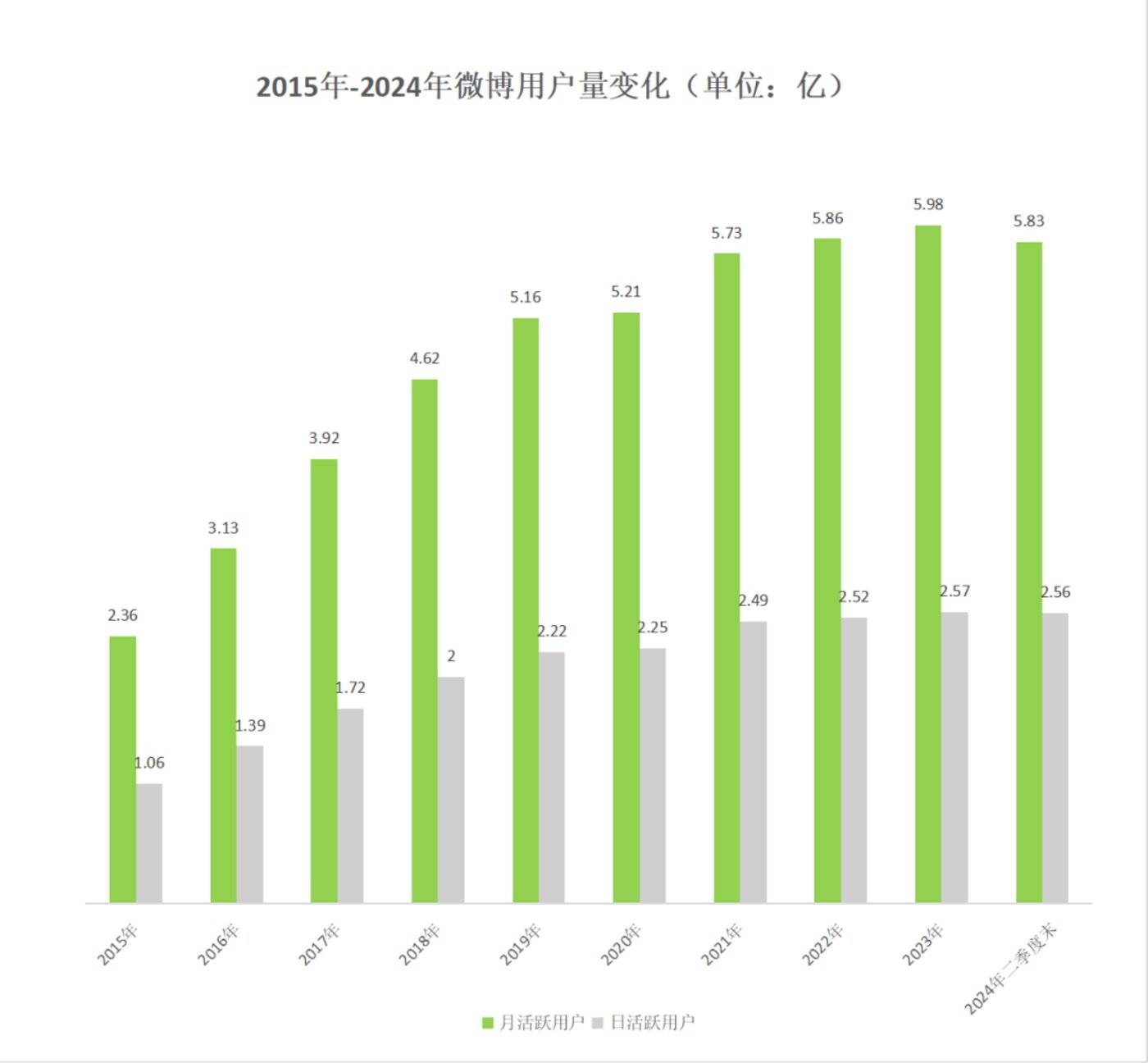 最新的财报数据显示,2024 年二季度末,微博的日活跃用户为 2.56 亿,月活跃用户为 5.83 亿。