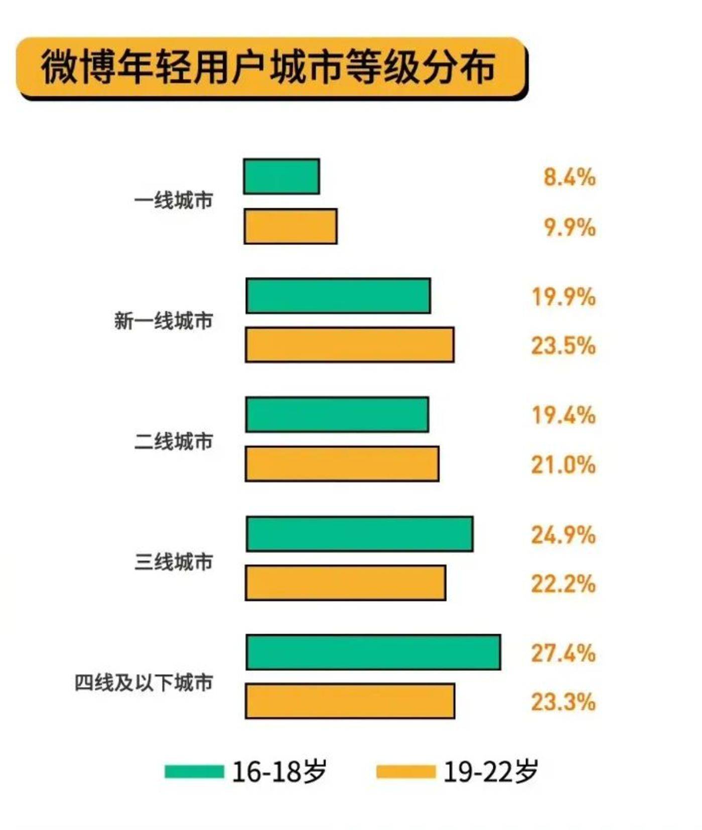 用户下沉的趋势一直保持,2023 年微博发布的 《年轻用户发展报告》 显示,在 2023 年三季度 6.05 亿的月活跃用户中,16~22 岁用户数量超过 1.3 亿,其中大多数用户来自二线及以下城市。