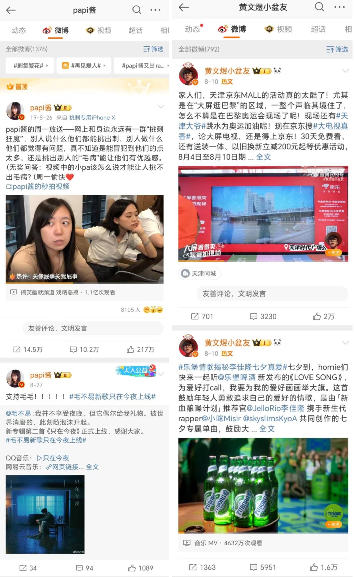 一些曾经参加 2016 年超级红人节的博主,如今尽管还在运营微博账户,但显然投入也减少了。papi 酱一如既往地在微博更新作品,但没有将小红书账号上的一些作品同步过来;黄文煜选择将微博作为营销平台,让一条又一条的广告占据着访问者的视线。