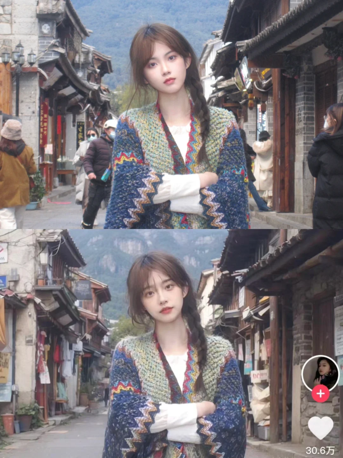 「上面是我在大理拍的照片,下面是被人 ai 换脸过的,400 多万观看,30 万点赞。甚至背景还用 ai 稍作了改变,真的被震惊到了。」
