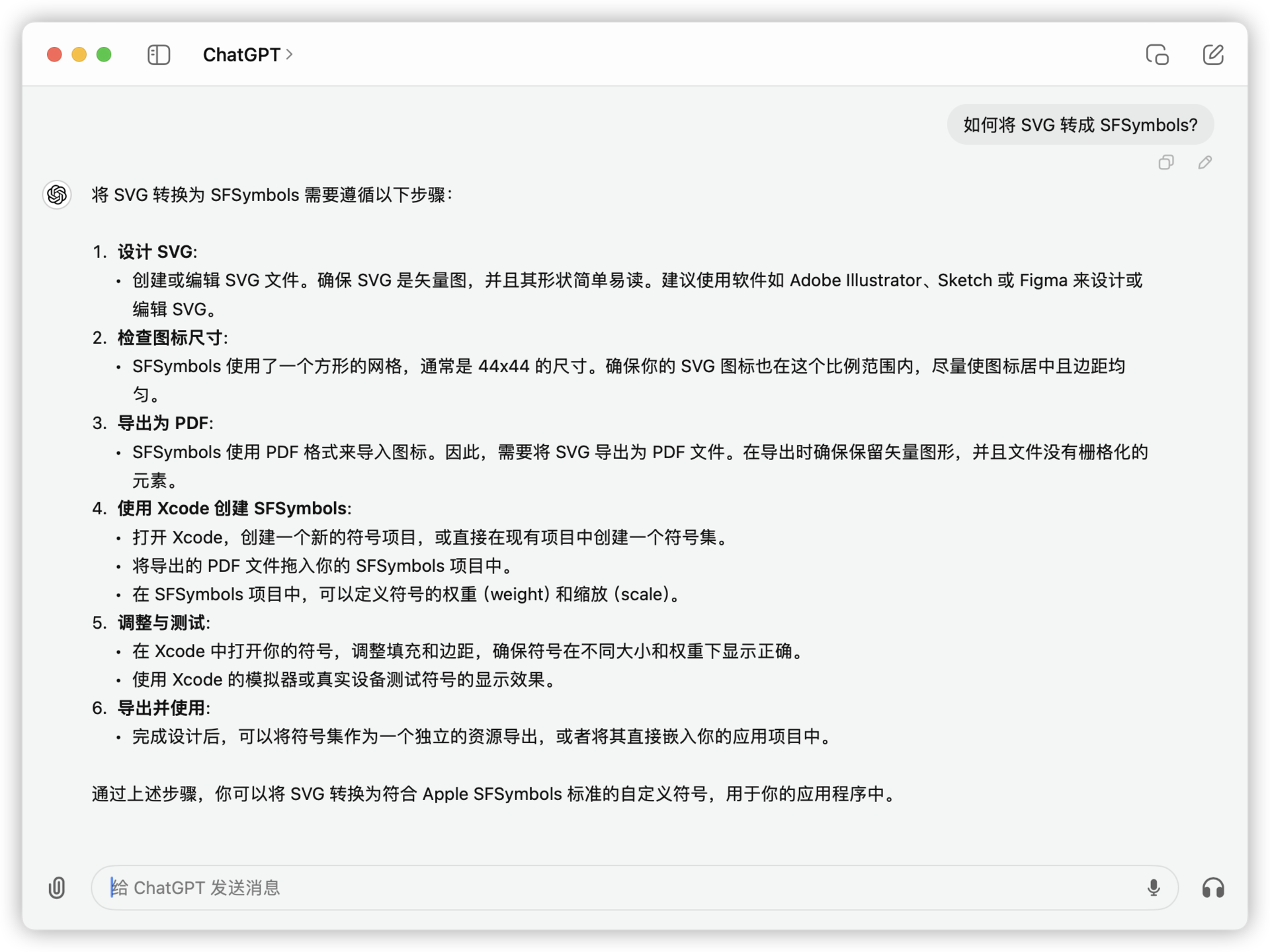 我就想着怎么能把 SVG 转成 SF Symbols,找了两个工具 App,都是收费的,连试用也没有,我就没敢直接付费。于是我就问了下 ChatGPT 怎么将 SVG 转换成 SF Symbols,AI 的回答如下: