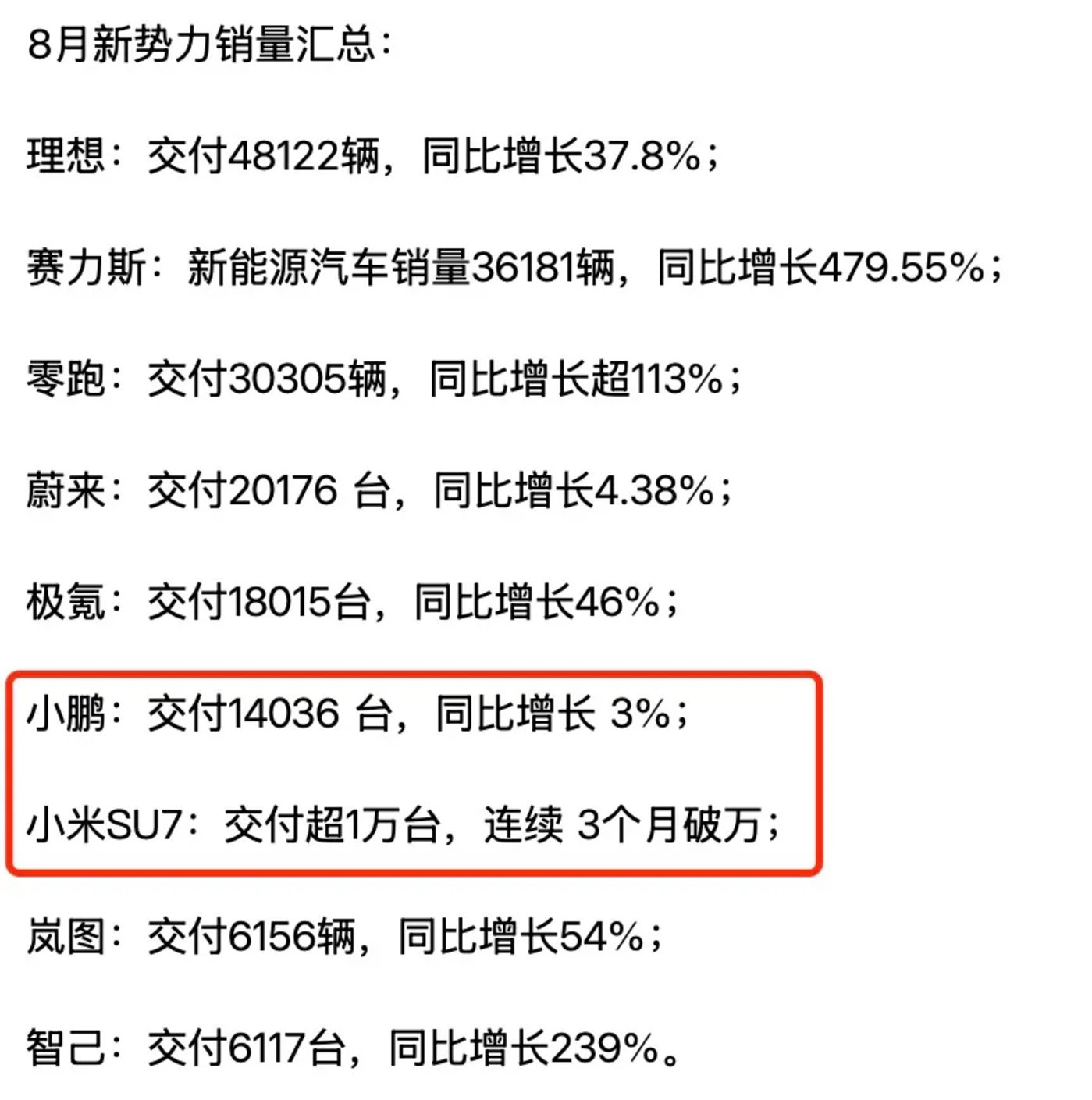 图/2024 年 8 月小鹏与小米销量 来源/张大喵说车 新能源观截图