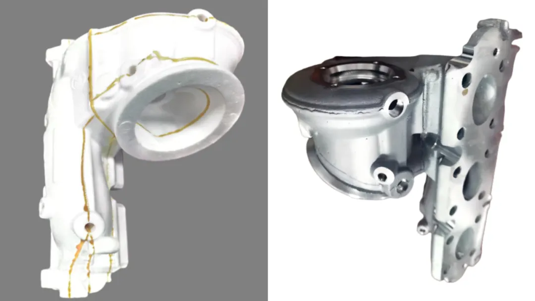 另外,基于金属模具与砂芯模具各自的物理特性,在进行复杂空腔结构的铸件铸造时,很难满足一些复杂腔体结构的铸造需求,在操作上对于温度、压力、砂芯的强度、辅助工艺 (如滑块等) 的配合等要求也极高,良品率的问题和后处理 (如手工清理毛刺) 的需求也给工厂额外增加了许多的成本。可以说,在面对一些外形奇形怪状,内腔错综复杂的高难度复杂件时,上述多种传统铸造工艺都较难实现低成本、高良品率。