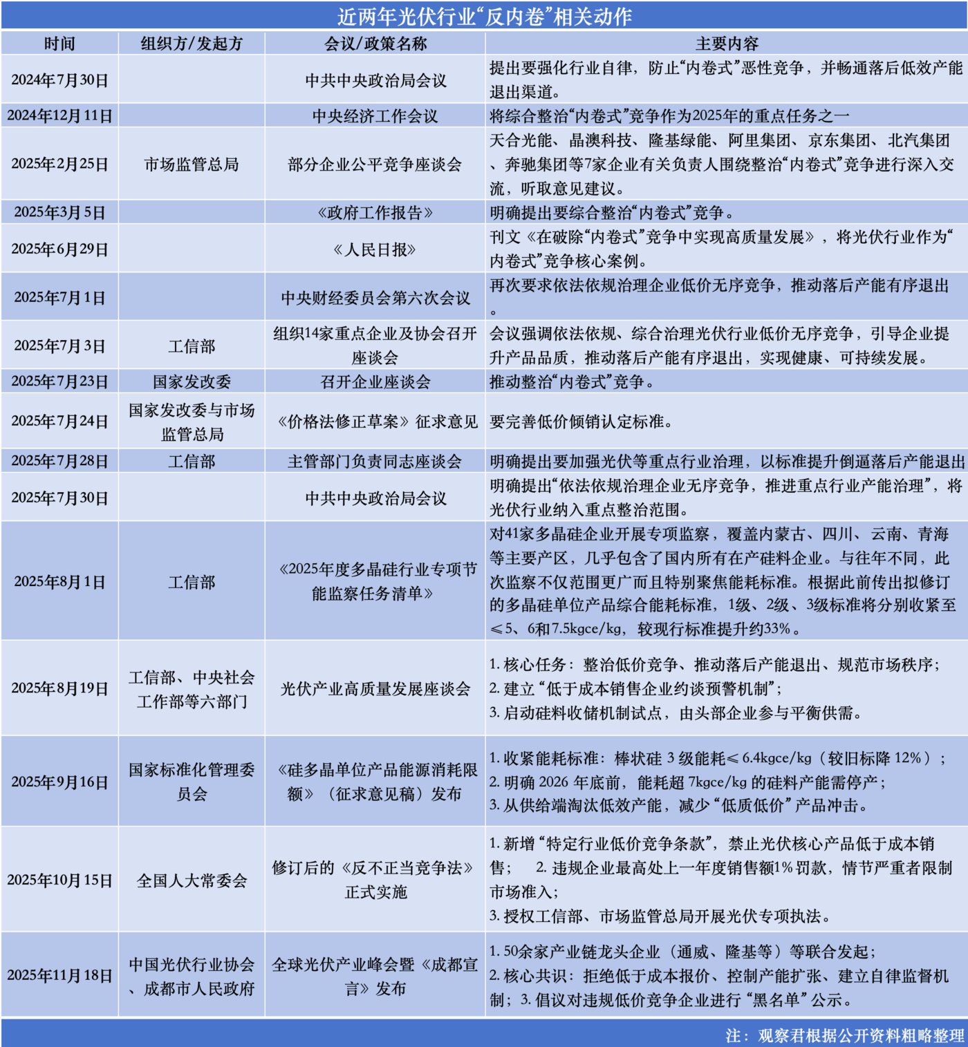 市场、业绩重压之下,中央层面接连高调发声,频频强调要严厉遏制恶性竞争、重塑公平有序的市场环境,「反内卷」 的号角在包括光伏在内的多个关键行业吹响。尤其 7 月以来,光伏行业进入 「反内卷」 攻坚战。