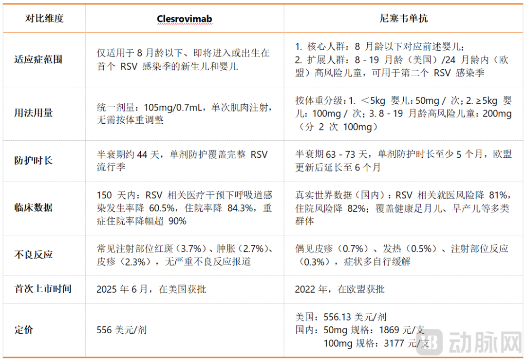 从公开的信息来看,目前上市的两款 RSV 预防性单抗在适应症范围、用法用量、防护市场、临床数据等方面都十分接近。主要的区别在于,经过适应症拓展,尼塞韦单抗可以被用于 8~19 月龄的儿童,来防护第二个 RSV 流行季的感染风险。在欧盟,这部分儿童的年龄上限被放宽到 2 周岁。此外,不同于尼塞韦单抗需要区分婴幼儿的体重来选择不同规格的针剂,Clesrovimab 针对不同体重的婴幼儿采用统一剂量进行肌肉注射。临床试验数据方面,Clesrovimab 的防护效果略优于尼塞韦单抗,但后者的不良反应发生率明显低于前者。